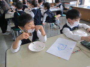 まずは午後から行う砥部焼陶芸館での絵付け体験の準備として絵付けの下書きから始まりました。