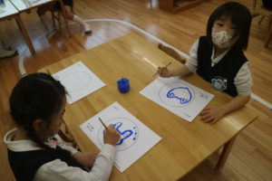 自分の塗った色が回すと綺麗に映り、すごーい!と歓声があがる様子も見られました。