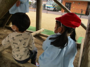 こちらは遊具の下。皆の大好きなとっておきの場所にお友だちを案内