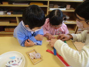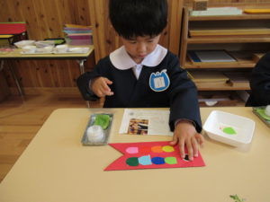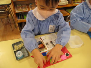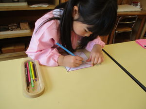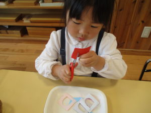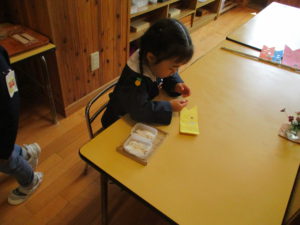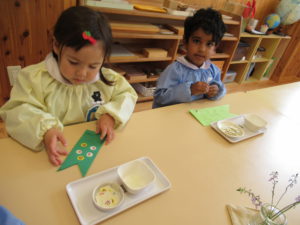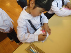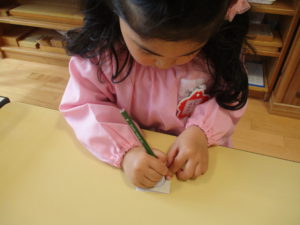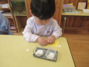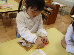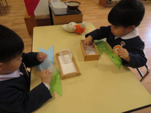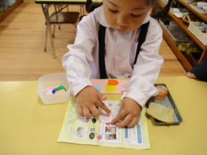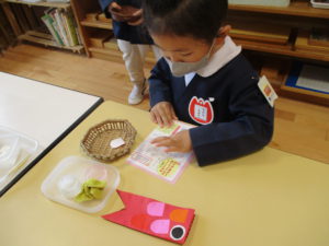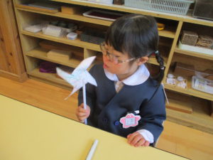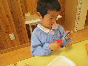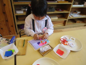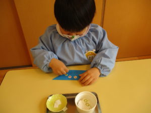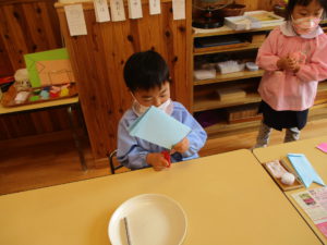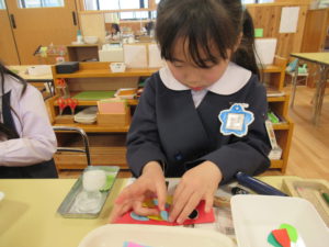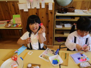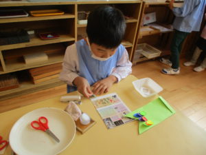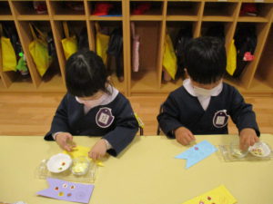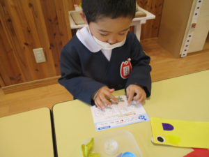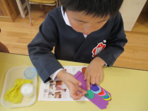普段している折り紙やのり貼りの活動で、どこに折り目をつければいいのか、どれくらいのりが必要なのか考えられるようになっている年中さん。