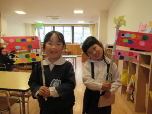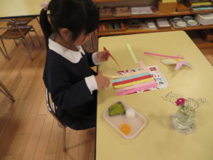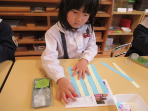 年中さんは折ったり、のりで貼ったりと年少さんより少し難しい作業もしながら作っていきます。