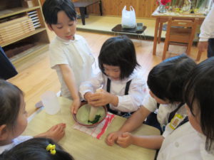 いただいたよもぎは園でよもぎ団子を作ったり、家に持ち帰って使ったりします。