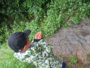 山水の通る竹筒をみつけ、足を入れてみると、水の出方がちょろちょろに。