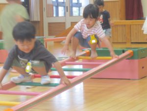 外で遊べない雨の日は、遊戯室で体をいっぱい
