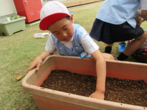 登園してくると、真っ先に野菜の元へ行きお水をあげます。