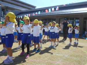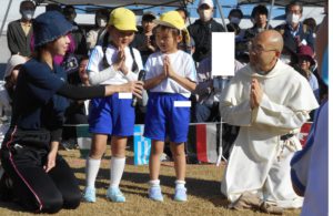 大勢の人が観ているいつもと違う雰囲気の中で、オープニングの鐘を鳴らしたあと、今日一日楽しく活動ができるように「主の祈り」をしました。