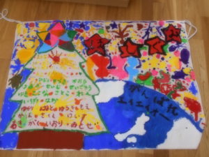 満3歳児から年長児まで大きな旗に、みんなの手形を押しました!