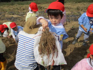 秋になり、6月に年長児が植えたさつまいもが収穫の時期を迎えました。