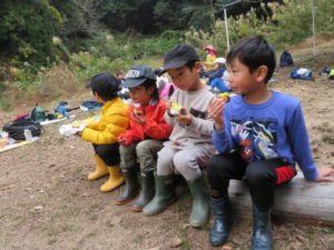 お弁当を食べながらも焼き芋が楽しみな子どもたちはちょっとソワソワ