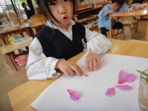 これは何?どうして?と知的好奇心の強まる年長さん。モンテッソーリ教育のコスミック分野に興味を持ち始めます。こちらでは、1つのお花を分解してみます。