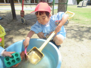 砂場では、タワシを使ってゴシゴシ。ピカピカになると嬉しそう。