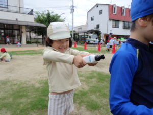 お家からもってきた洗剤などの自分だけの水鉄砲にブクブクと水をためて…。