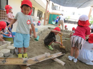 『砂場で遊ぶ』その中で子どもたちはたくさん考え、色々な発見をしています。