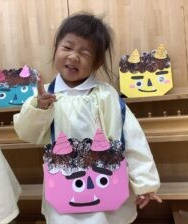紙袋を被り、友だちに「目はここだよ~口はここ!」と伝えながら