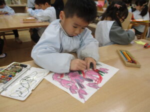 かおり先生の部屋の戸に付けている『おにばら』お話を聞き、その後大型絵本を読んでもらってお部屋に帰りました。