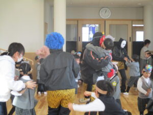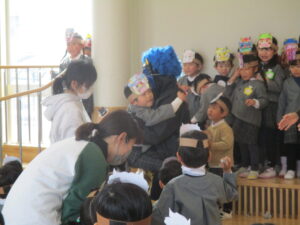 「こわーいよー」「ママー!!!」「いい子になるよ」と泣く人や、新聞で作った豆を鬼に必死で投げている人もいました。