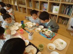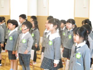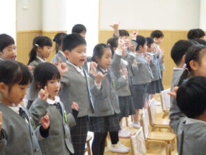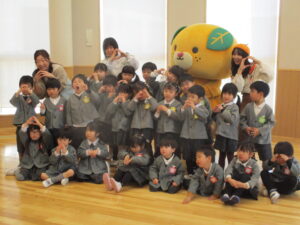 東予信用金庫・飯尾理事長様より年長児に、年長児顔入りタオルの贈呈式がありました。