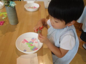 〇△▢で遊んだ後、赤、青に分けていきます。
