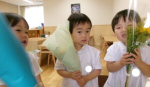 子どもたちが献花してくれたお花を花束にして、幼稚園のことを大切に見守ってくださっている地域の方々にお配りしました。