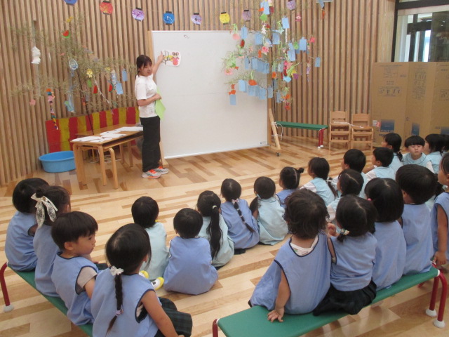 集会では七夕のお話やどんな食べ物を食べるかなど七夕のついてお話を聞きました。