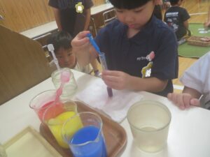 7月に入り年長児は、色の実験に取り組みました。