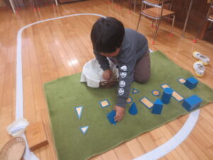 教具の中で子どもたちがよく取り組む活動に“幾何立体のかご”があります。