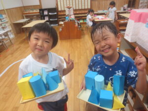 年少児の頃からいろいろな立体に触れ、小人のおうちを作ったり、平面を