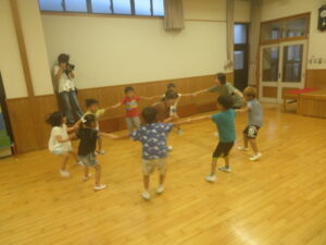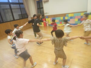 手を繋いでいる輪があっちへ行ったりこっちへ来たり。