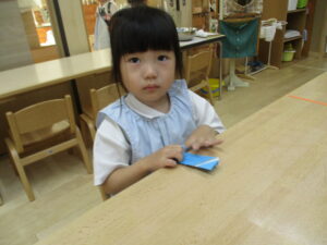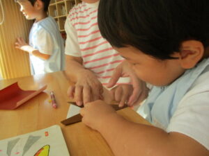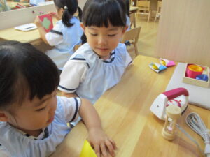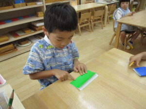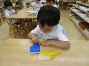 「折り紙、ここを折るよ」先生と一緒に折ります。
