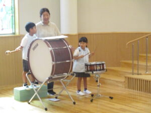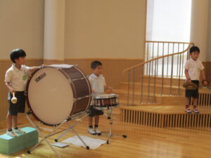 大太鼓、小太鼓をリズムに合わせて、叩きます。