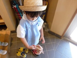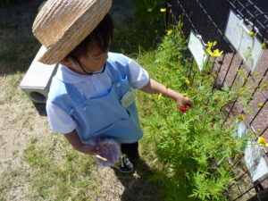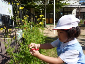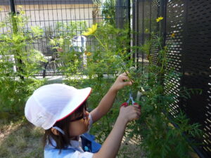 かごとはさみを持って、園庭にお花を探しに行きます。
