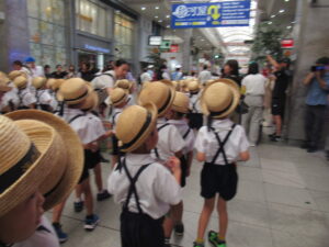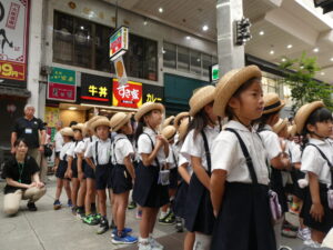 出発式が行われる三越前に松山東雲中学・高等学校吹奏楽部の皆さん、松山東交通安全協会の方等々、一緒にパレードをする地域の方々と整列し、たくさんの人たちに少し緊張している様子の子ども達。