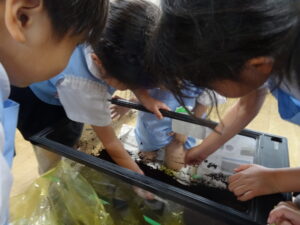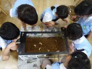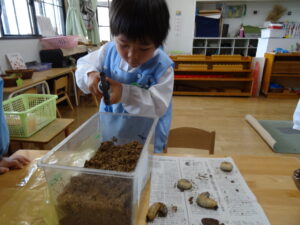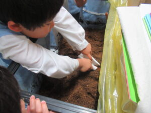 クラスで冬から育てていた、かぶとむしの幼虫が動きだしました。