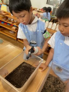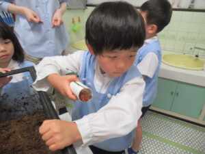新しく、栄養たっぷり入った土を今日はみんなで入れることに。