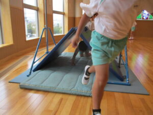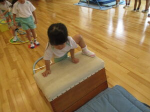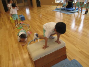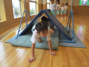 山になったマットを潜ります。年長さんは上手ですね。