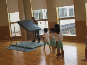 先生が動かすマットの下を潜ります。ぶつからないように気を付けてね。