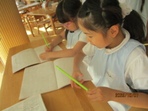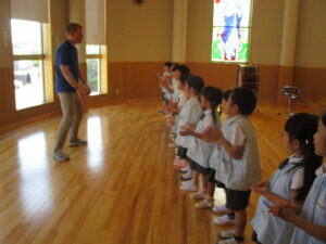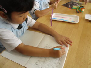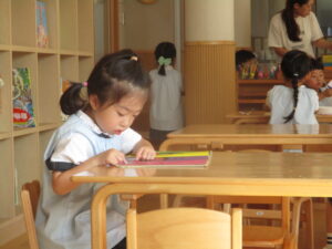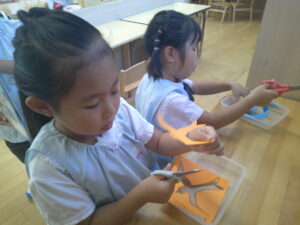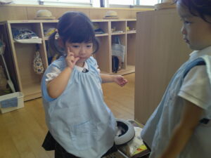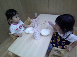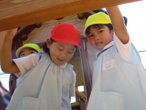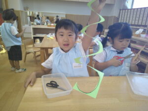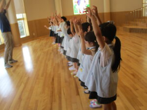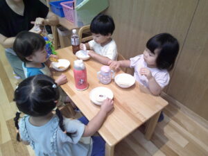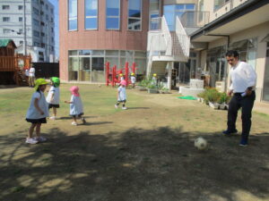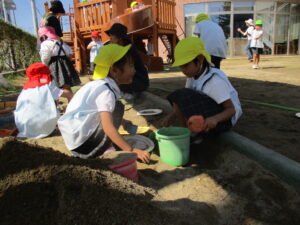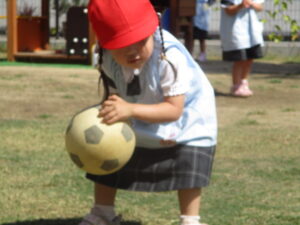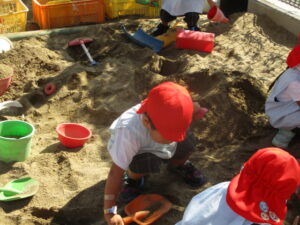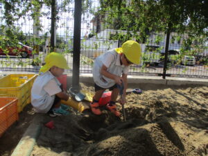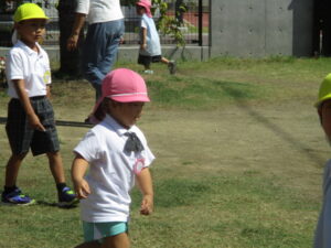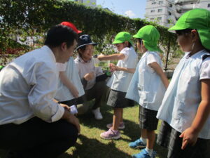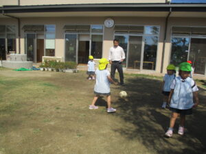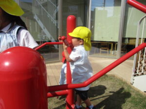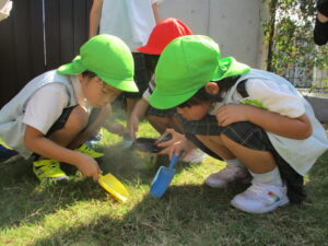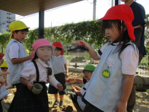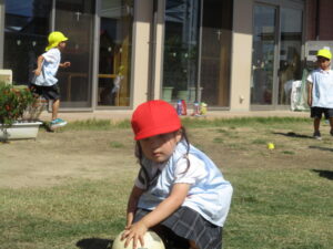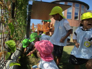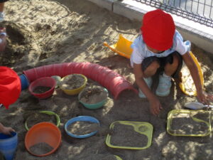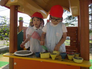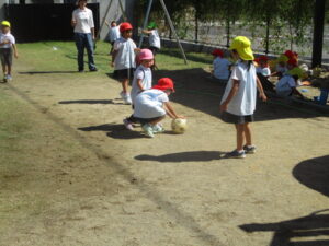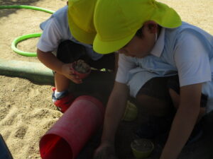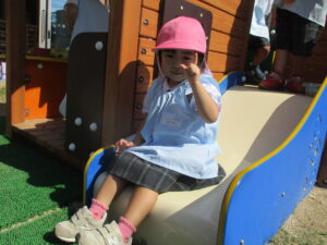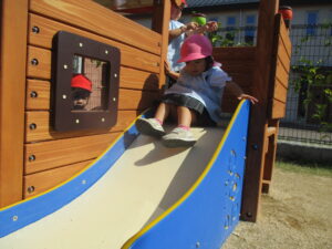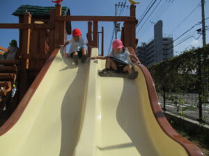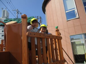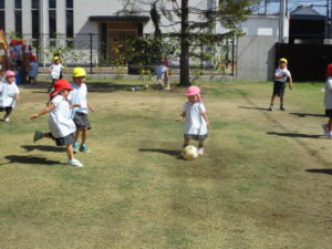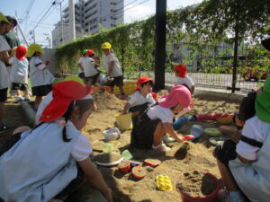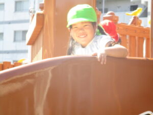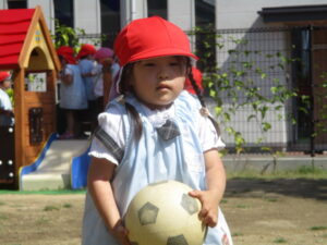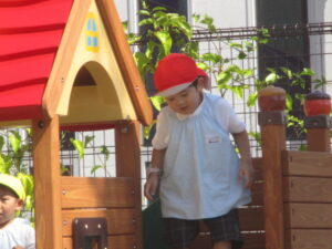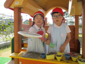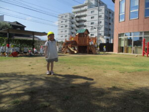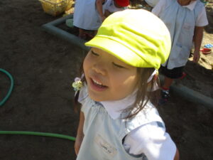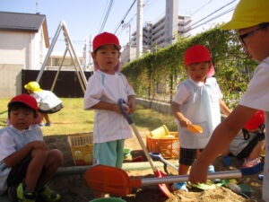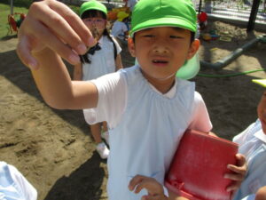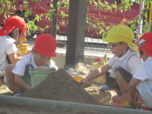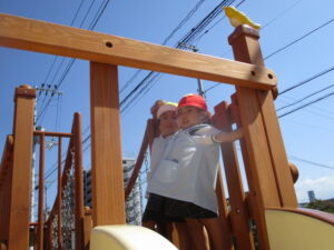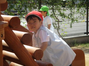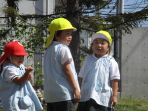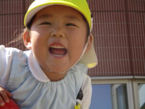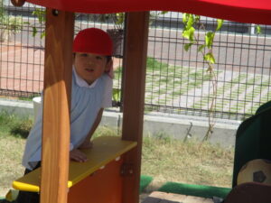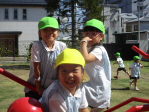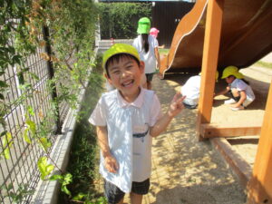 暑いけど、園庭で友だちと一緒に言い笑顔!