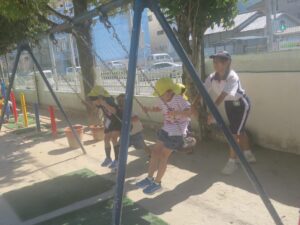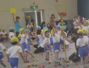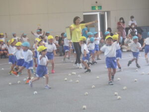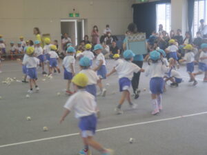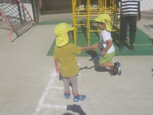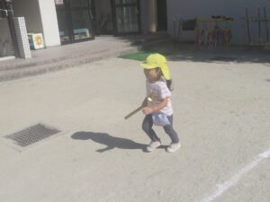 遊びの中で年長さんの真似をしてバトンを持ち一生懸命走る