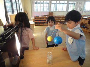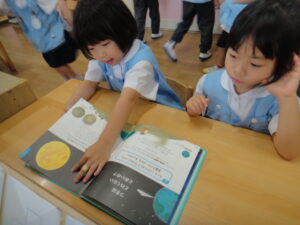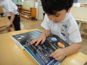 惑星についてとても興味を示している年少さんは、コスミックのコーナーでいつも夢中になって惑星の本を読んでいます。