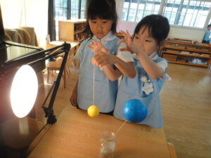 太陽に見立てたライトで、月に見立てた黄色い球を照らします。