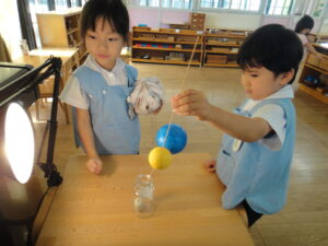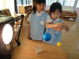 モンテッソーリ教育の中に位置づけられているコスミック教育。それは、宇宙、地球、月、星、風などの自然の神秘を始め、数限りない不思議に心動かされる子どもたちの興味や要求に答えるものです。