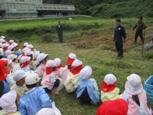 畑に着くと、さつまいものお世話をしてくださっていた方が待ってくれていて、『さつまいもができるまでの話』、『さつまいもの掘り方』について丁寧に教えていただきました。