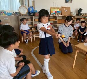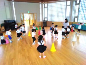 年中児・年長児は、毎週月曜日の帰りの会の時間に「線上歩行」に取り組んでい
