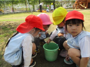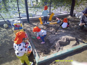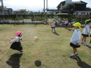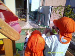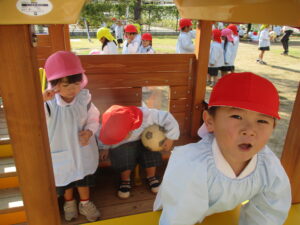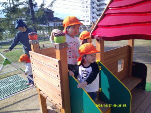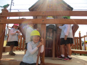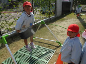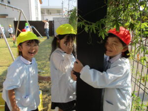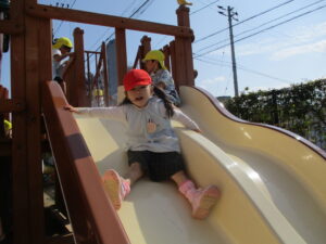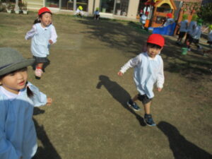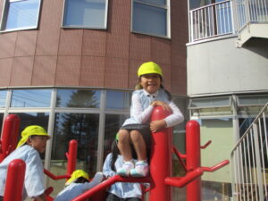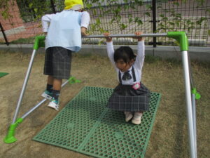 子どもたちは園庭で、走ったり、総合遊具や鉄棒などをして、活発に遊びました。