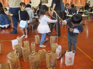 わなげが入った本数によってくじ引きができる回数が決まります。