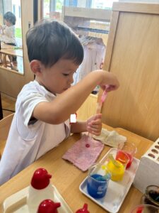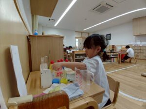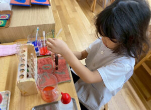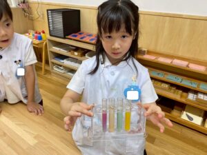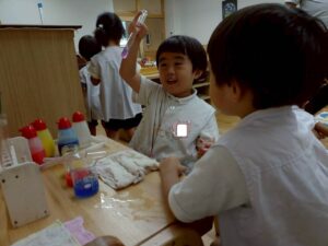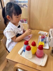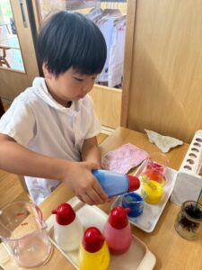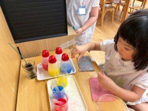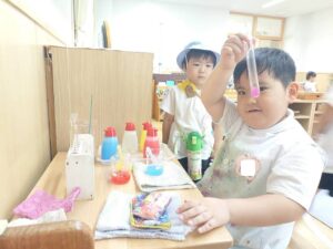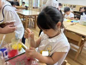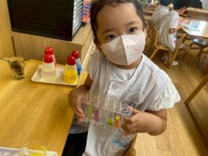 二学期が始まり、子どもたちが幼稚園の生活に慣れてきた頃、お部屋では色水実験の紹介をしました。