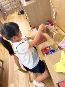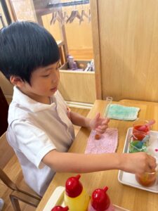 園生活の中で、絵の具と紙粘土を使ってクリスマス製作を行う年長児の口から、 「あおと きいろをまぜて みどりをつくろう」「いろみずのじっけんで やったよね」という言葉も聞こえてきました。