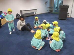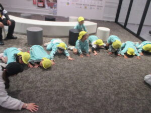 地震が来た時にはカエルのポーズで身を守ることをおしえてもらあったり