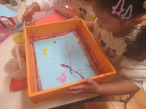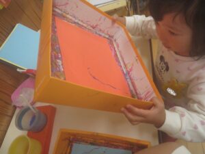 絵の具のついたどんぐりを箱の中に入れてゆ~らゆら~