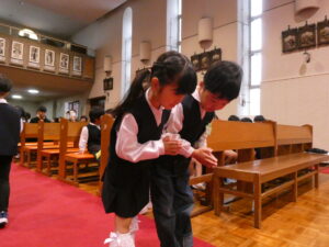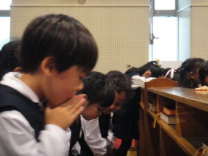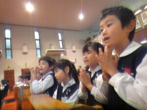 家族のこと、友達のこと、世界のこと、子ども達がそれぞれの思いを自分の言葉で神様に願います。